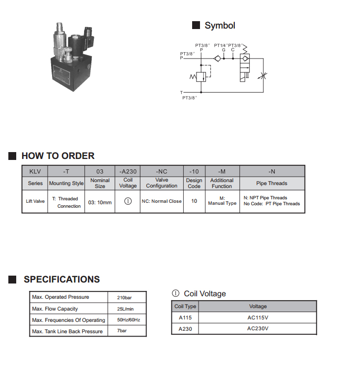 Modèle KLV La soupape de levage hydraulique s'applique au système hydraulique à simple effet à une seule boucle, etc. Il est largement utilisé dans les ascenseurs, les plates-formes élévatrices et l'équipement de levage logistique. La soupape de commande de levage hydraulique est une vanne combinée contenant une soupape de régulation de pression de type cartouche, un clapet anti-retour, une vanne de régulation de débit et une électrovanne bidirectionnelle à deux voies.