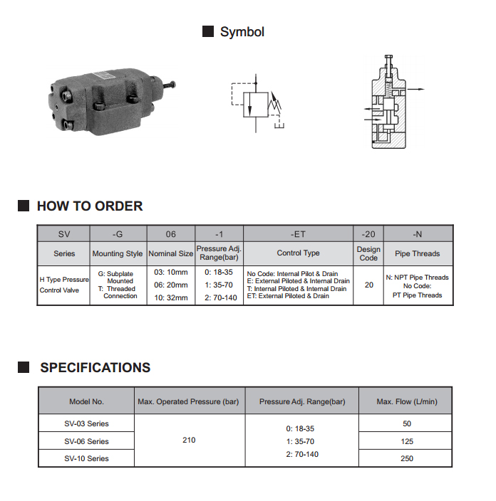 Le modèle SV est une sorte de vanne de séquence à action directe, y compris les vannes de séquence, les soupapes de déchargement et les soupapes de décharge à basse pression, peut être actionnée par une commande de pression interne ou externe. Le montage en forme de plaque et le montage en ligne sont disponibles.