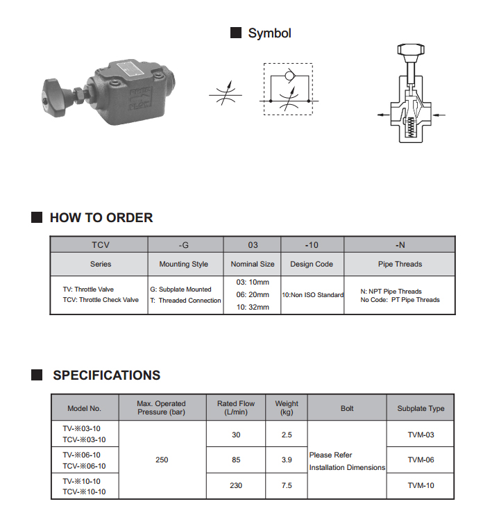 Cette soupape d'étranglement comporte deux modèles: TV et TCV, qui sert à ajuster la vitesse des actionneurs dans le circuit du système. Il dispose d'une soupape d'étranglement de type plaque et d'une vanne d'étranglement montée en ligne.